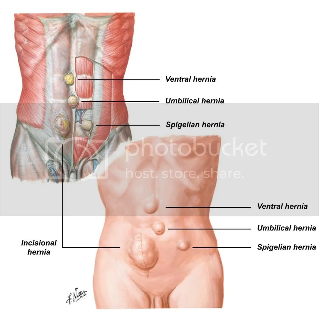 Đau ở bụng dưới được quan sát thấy ở phụ nữ bị thoát vị bẹn, thoát vị đường trắng hoặc đường Spigelian. Đau nhức xảy ra khi căng, ép các cơ quan trong ổ bụng bằng quần áo chật hoặc thắt lưng. Theo thời gian, do sự gia tăng của lồi cầu sọ nên cơn đau trở nên vĩnh viễn. Đau cấp tính ở khu vực túi sọ và không thể định vị lại vào khoang bụng cho thấy thoát vị bị giam giữ .