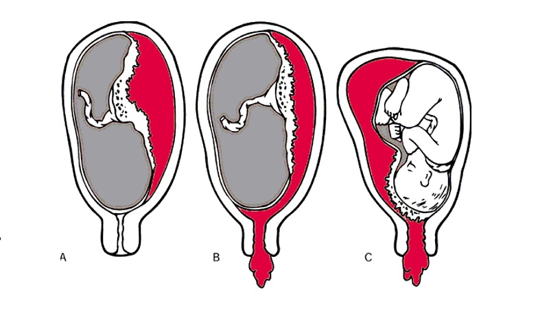 Đau âm ỉ dữ dội hoặc kịch phát ở vùng bụng dưới, kết hợp với chảy máu, có thể là dấu hiệu của bong nhau thai sớm. Bụng dưới trở nên cứng và căng, khi thăm dò vùng này thì cơn đau tăng lên. Đôi khi cơn đau dữ dội đến nỗi một số phụ nữ bất tỉnh. Tình trạng này chủ yếu phát triển sau tuần thứ 20 của thai kỳ.