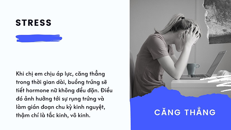 Căng thẳng trầm trọng và kéo dài làm thay đổi quá trình sản xuất gonadotrophin hormone (GnRH) – một loại hormone tiết ra ở vùng dưới đồi. Hormone này đóng vai trò then chốt trong quá trình thúc đẩy sản xuất hormone tuyến yên và hormone sinh dục tại buồng trứng. Lượng hormone GnRH suy giảm kéo theo sự suy giảm của các loại hormone khác liên quan, và vì thế quá trình rụng trứng không còn diễn ra đều đặn nữa.