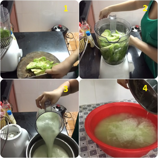 • Dùng khăn xô lọc lấy nước cốt của mướp đắng vừa say được. Đun sôi nước ép mướp đắng,  vặn nhỏ lửa đun tiếp tầm 3 – 5 phút thì tắt bếp.